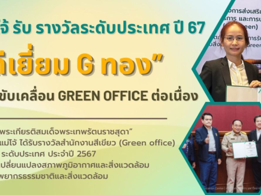 ชื่อ/ข้อมูลรางวัล : “อาคารเฉลิมพระเกียรติสมเด็จพระเทพรัตนราชสุดา” มหาวิทยาลัยแม่โจ้ ได้รับรางวัลสำนักงานสีเขียว ( Green office) ระดับดีเยี่ยม ระดับประเทศ ประจำปี 2567 จากกรมการเปลี่ยนแปลงสภาพภูมิอากาศและสิ่งแวดล้อม กระทรวงทรัพยากรธรรมชาติและสิ่งแวดล้อม