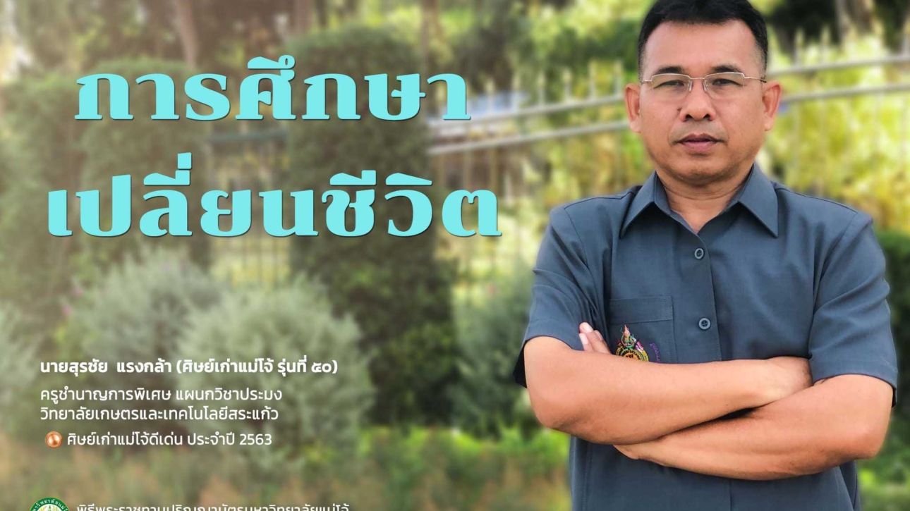 นายสุรชัย แรงกล้า เป็นศิษย์เก่าแม่โจ้รุ่น 50 สําเร็จการศึกษาระดับมัธยมศึกษา จากโรงเรียนสามโคก จังหวัดปทุมธานี เมื่อพุทธศักราช 2525 สําเร็จการศึกษาระดับประกาศนียบัตรวิชาชีพ สาขาเกษตรกรรม จากวิทยาเขตเกษตรปทุมธานี เมื่อพุทธศักราช 2527 สําเร็จการศึกษาประกาศนียบัตรวิชาชีพชั้นสูง สาขาประมง จากวิทยาเขตเกษตรปทุมธานี เมื่อพุทธศักราช 2529 สําเร็จการศึกษาปริญญาตรี เทคโนโลยีการเกษตรบัณฑิต สาขาวิชาสัตวศาสตร์ (ประมงน้ำจืด) จากสถาบันเทคโนโลยีการเกษตรแม่โจ้ (ปัจจุบัน คือ มหาวิทยาลัยแม่โจ้) เมื่อพุทธศักราช 2530 สําเร็จการศึกษาปริญญาโท สาขา หลักสูตรและการสอน จากมหาวิทยาลัยราชภัฏวไลยอลงกรณ์ ในพระบรมราชูปถัมภ์ เมื่อพุทธศักราช 2547 ด้านประวัติการทํางาน นายสุรชัย แรงกล้า ดํารงตําแหน่งนักวิชาการประมง บริษัท เนาวรัตน์ แฮทเชอร์รี่ เมื่อพุทธศักราช 2530-2531 ดํารงตําแหน่งนักวิชาการประมง กรมประมง เมื่อพุทธศักราช 2531-2532 เข้ารับราชการตําแหน่งครู ที่วิทยาลัยเกษตร และเทคโนโลยีสระแก้ว เมื่อพุทธศักราช 2532…