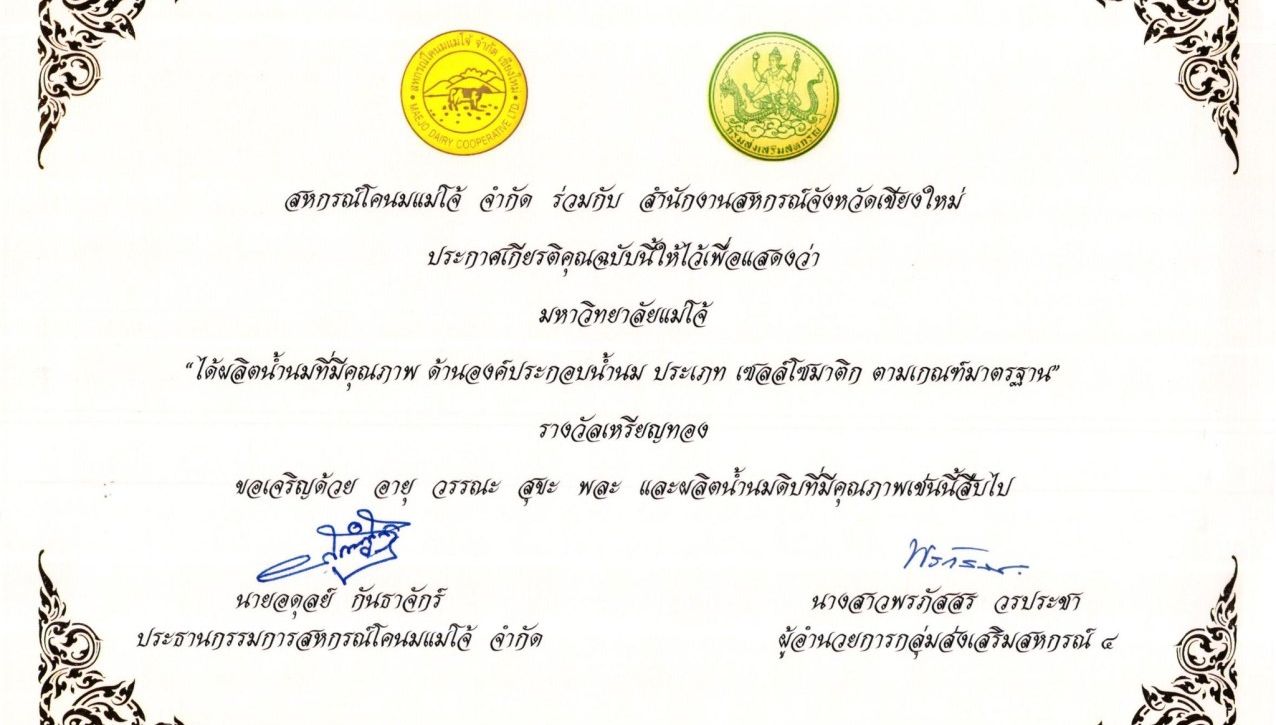 ข้อมูลรางวัล ชื่อรางวัล : รางวัลเหรียญทองด้านโคนม องค์กร/ผู้ให้รางวัล : สหกรณ์โคนมแม่โจ้ จำกัด ร่วมกับ สำนักงานสหกรณ์จังหวัดเชียงใหม่ รายละเอียด : วันพุธที่ 10 เมษายน 2567 นายอภิชาติ หมั่นวิชา นักวิชาการสัตวบาลชำนาญการ เป็นตัวแทนเข้ารับใบประกาศเกียรติคุณและเกียรติบัตร ของฟาร์มโคนมและโคเนื้อ คณะสัตวศาสตร์และเทคโนโลยี มหาวิทยาลัยแม่โจ้ ซึ่งได้รับ “รางวัลเหรียญทอง” ด้านโคนม โดย “ได้ผลิตน้ำนมที่มีคุณภาพ ด้านองค์ประกอบน้ำนม ประเภท เซลล์โซมาติก ตามเกณฑ์มาตรฐาน” ในผลเซลล์โซมาติกไม่เกิน 200,000 เซลล์ ประจำปี 2566 จากสหกรณ์โคนมแม่โจ้ จำกัด ร่วมกับ สำนักงานสหกรณ์จังหวัดเชียงใหม่ และได้ผ่านการประเมินเกษตรกรโคนมเป็น Smart farm จากองค์การส่งเสริมกิจการโคนมแห่งประเทศไทย (อ.ส.ค.) ณ ศูนย์ถ่ายทอดเทคโนโลยีสหกรณ์ที่ 9 ประเภทรางวัล : การผลิตน้ำนมที่มีคุณภาพ ประเภท เซลล์โซมาติก ตามเกณฑ์มาตรฐาน…