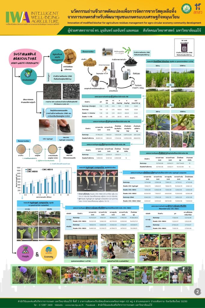 โครงการ IWA Intelligent Well-Being Agriculture ได้นำเสนอนวัตกรรมสำคัญในการจัดการเศษวัสดุเหลือใช้ทางการเกษตร โดยเฉพาะฟางข้าวหรือแกลบ ด้วยการพัฒนา ไบโอชาร์ดัดแปลง (Modified Biochar/Hydrogel Composite) ภายใต้แนวคิด Bio-Circular Economy (BCE) เพื่อสร้างชุมชนปลอดขยะ (Zero Waste Community) และส่งเสริมเกษตรกรรมยั่งยืน. นวัตกรรมนี้ได้จัดทำโดย ผู้ช่วยศาสตราจารย์ ดร. มุจลินทร์ ผลจันทร์ แและคณะ.